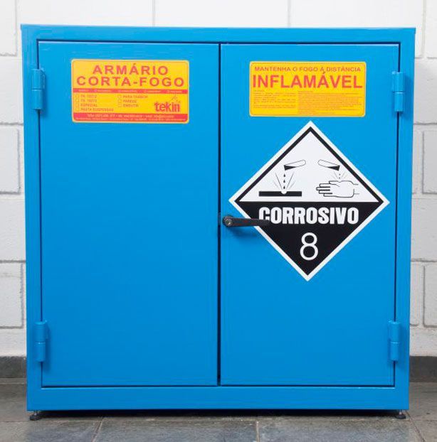 Armário corta-fogo para corrosivos construído em chapas de aço carbono interna e externamente, com camada de isolante resistente em todo o contorno. Possui abertura superior e inferior com duplo sistema corta-chamas que funciona como respiro de ventilação para gases leves e pesados.